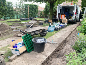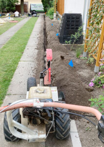 Továbbá, az autóbejáró alatt előretekintve két 110 cm-es KGU csövet helyeztünk el, hogy biztosítsuk a kényelmes bővítés lehetőségét.